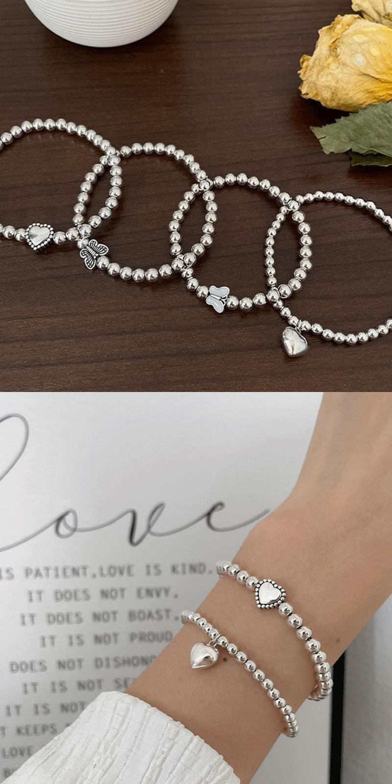 シルバーカラービーズバタフライラブハートブレスレット女性甘いロマンチックなジュエリークリックパーティーアクセサリー 大人ガーリー スウィート キュート カジュアル 銀 Liv23779745167