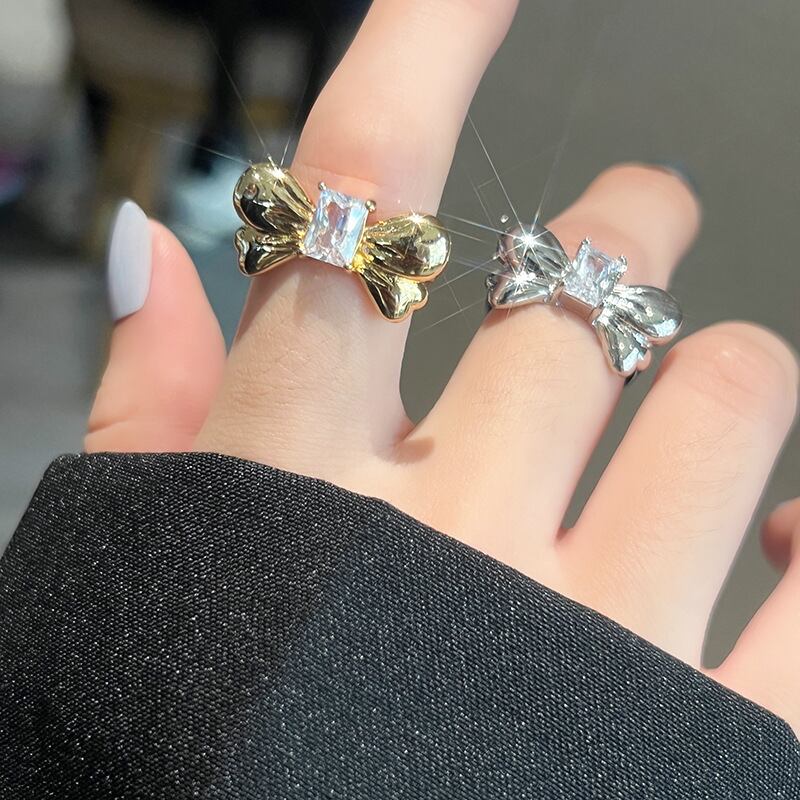 LIVVY シルバーカラーのユニークなちょう結びジルコンオープンリング女性ガールトレンディなウェディングパーティージュエリーギフト リボン 指輪 銀 Liv53790238329