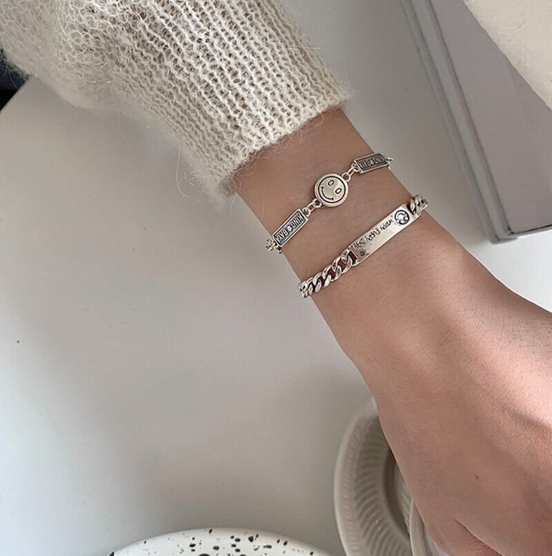 LIVVY 笑顔スクエア文字太いチェーンチャームブレスレット女性ラウンドタイシルバーカラーのトレンディなパーティージュエリー 銀 スクウェア Liv67453416487
