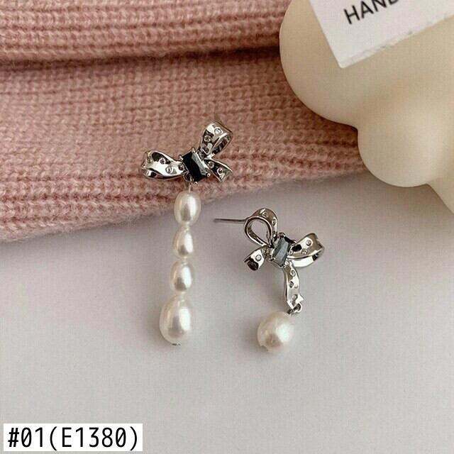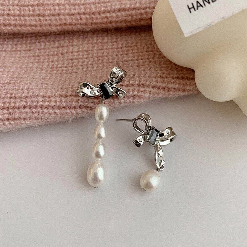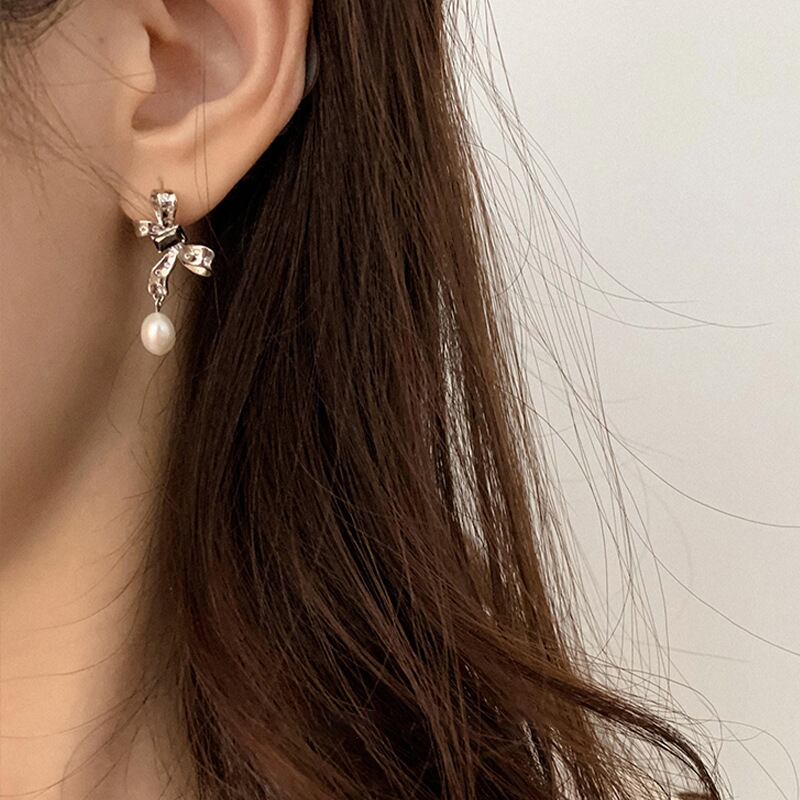 LIVVY シルバーカラートレンディな弓ノットパールスタッドピアス女性のレトロなウェディングパーティージュエリーアクセサリーギフト リボン イヤリング 真珠 リング 指輪 銀 Liv62297806504