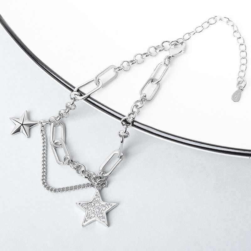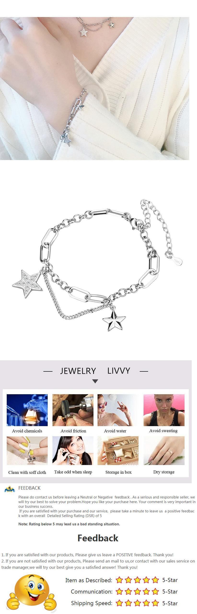 LIVVY シルバーカラーダブルスター光るジルコンペンダントブレスレットチェーン絶妙なユニークな手作りジュエリーギフト 銀 Liv67616033818