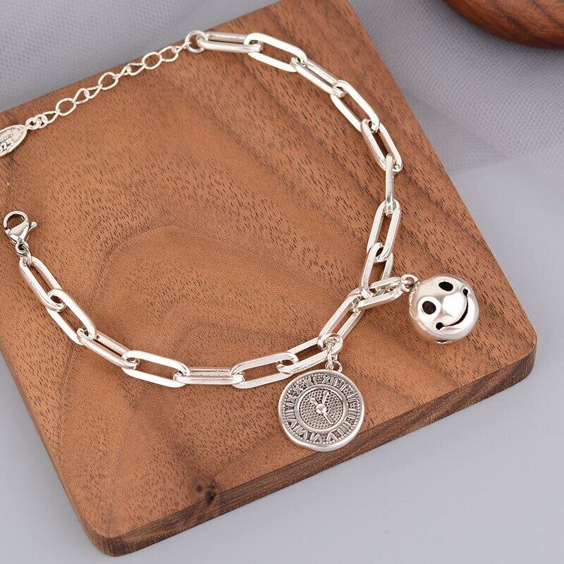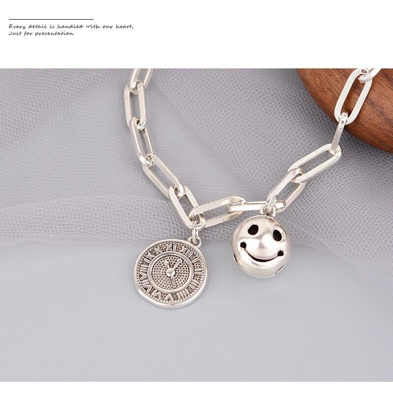 LIVVY シルバーカラー太いチェーン球状スマイリーフェイスペンダントブレスレットインカップルダイヤルジュエリー 銀 Liv13656992582