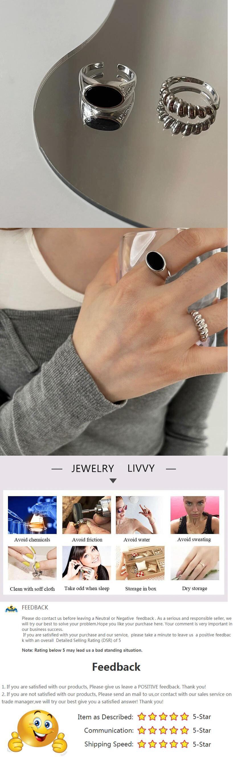 LIVVY シルバーカラー ストライプ ブラック オーバル ジルコン 光沢のあるリング 気質 Clic ジュエリー アクセサリー 指輪 銀 Liv29315354643