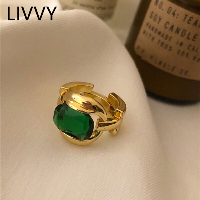 LIVVY シルバーカラー シンプル グリーンストーン ゴールドカラーリング レトロ オープニング 手作りリング ファインジュエリー トレンド 指輪 銀 Liv33465989460