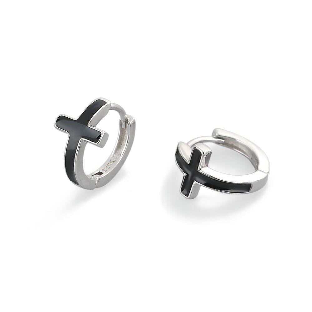 LIVVY シンプルな黒十字小さなフープシルバーカラーのイヤリングの男性と女性のヒップホップパンクストリートジュエリー ブラック 指輪 銀 Liv16941587226