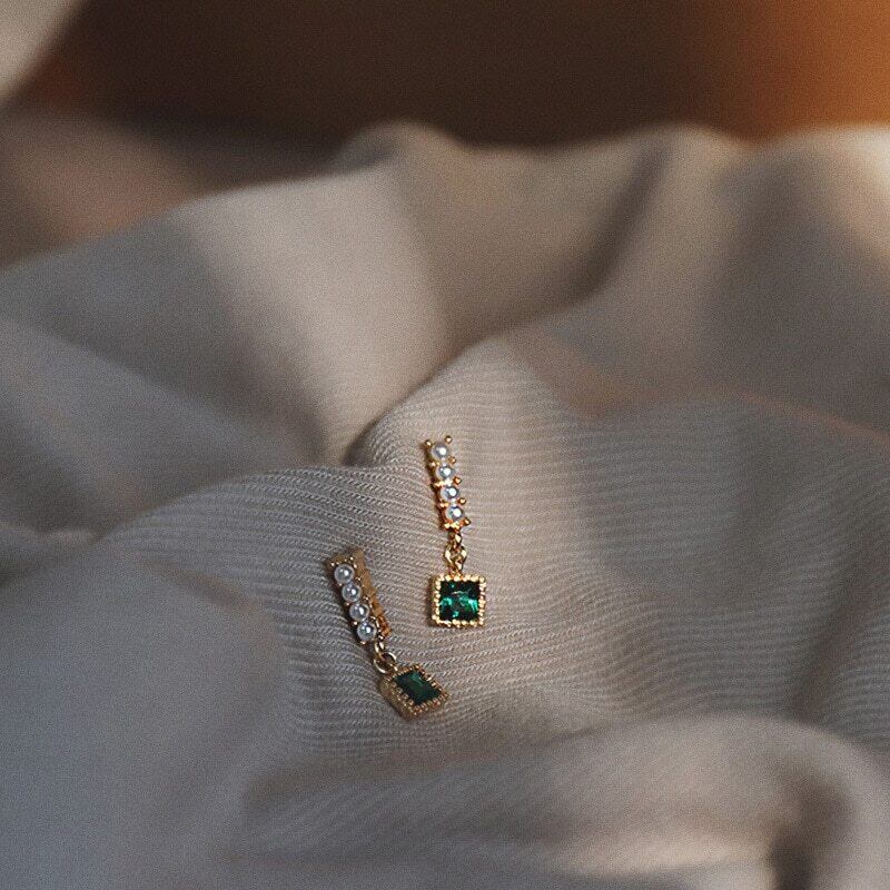 LIVVY スクエア グリーン ジルコン パール ショート ピアス ハンドメイド ユニーク チャーム ジュエリー ギフト イヤリング 真珠 リング 指輪 スクウェア Liv45415150311
