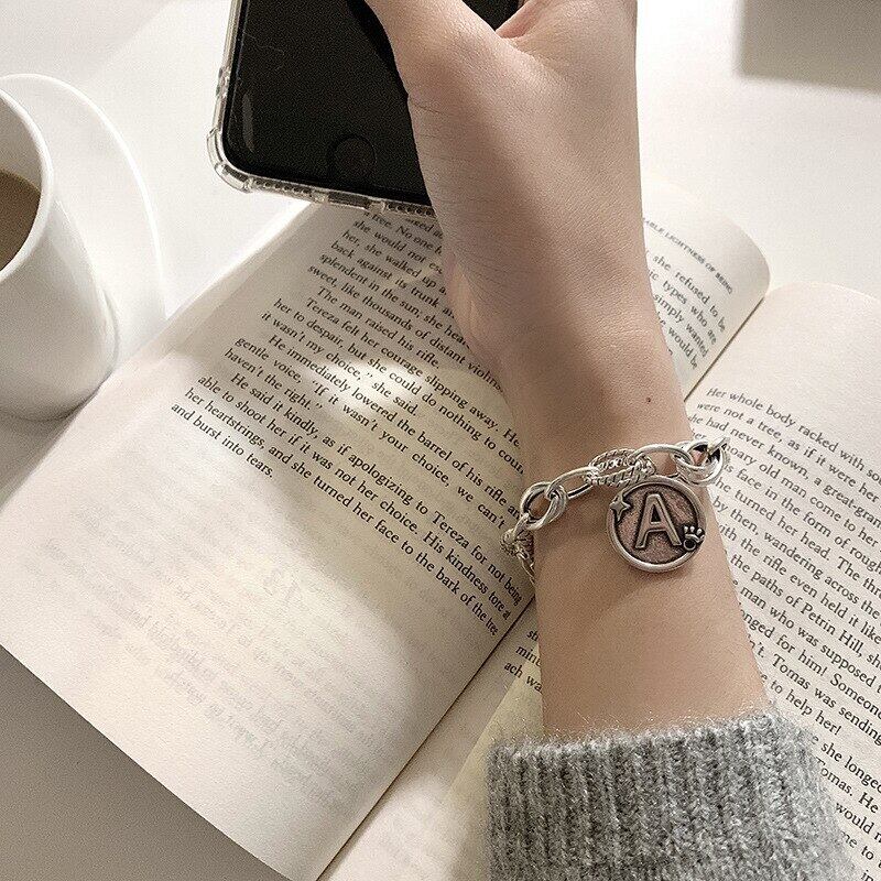 LIVVY タイのシルバー色の文字 A ラウンドペンダントブレスレット女性クリエイティブ太いチェーン手作りジュエリーパーティーギフト 銀 Liv88862318729