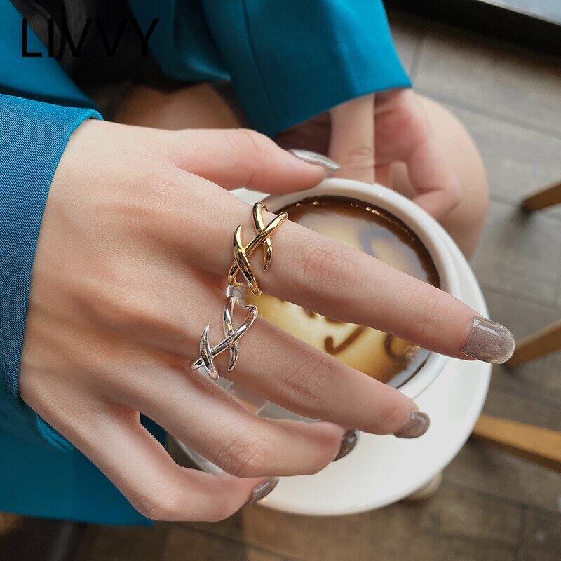 LIVVY シルバーカラーオープン二重層クロスリング女性ゴシックアクセサリージュエリーパーティーパーソナリティジュエリー 指輪 銀 Liv87919685603