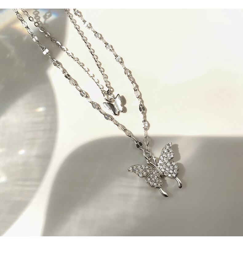 LIVVY シルバーカラー二重層ネックレス蝶ジルコンペンダント鎖骨チェーンジュエリーパーティーギフト レース 銀 Liv85263442987