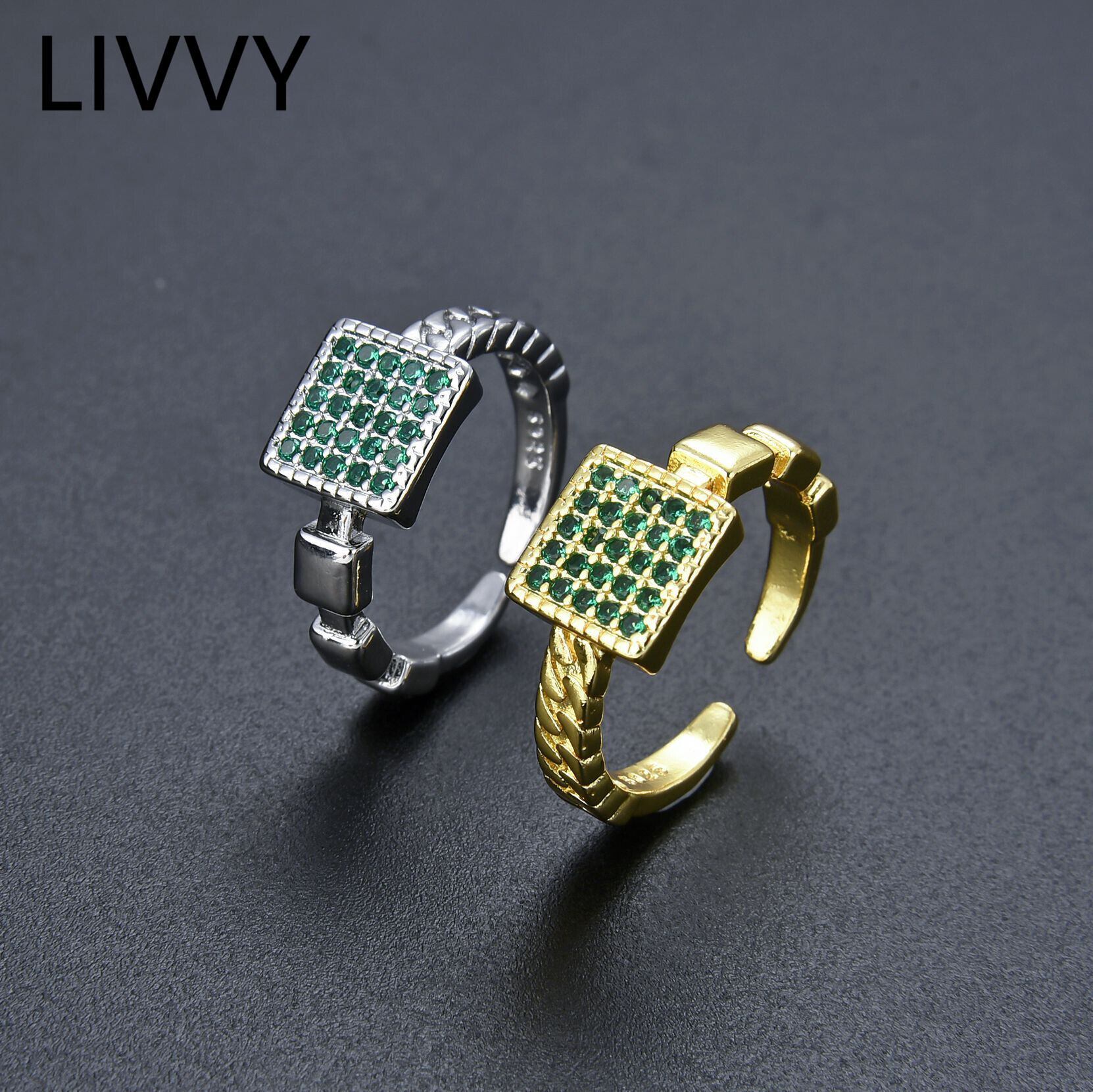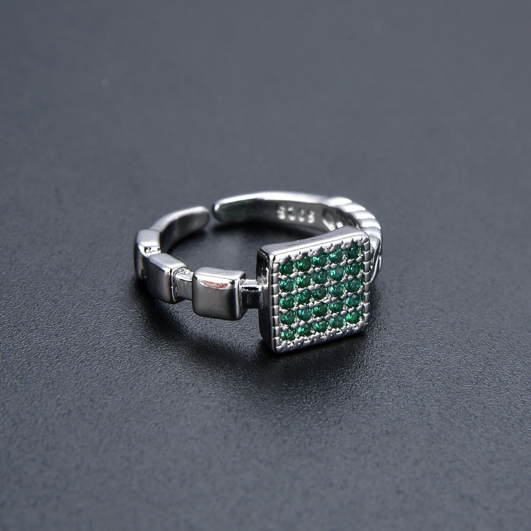 LIVVY シルバーカラースクエア象眼グリーンジルコンオープン調節可能なリングシンプルな光の高級パーティージュエリー アジャスタブル 指輪 銀 スクウェア Liv86344310784