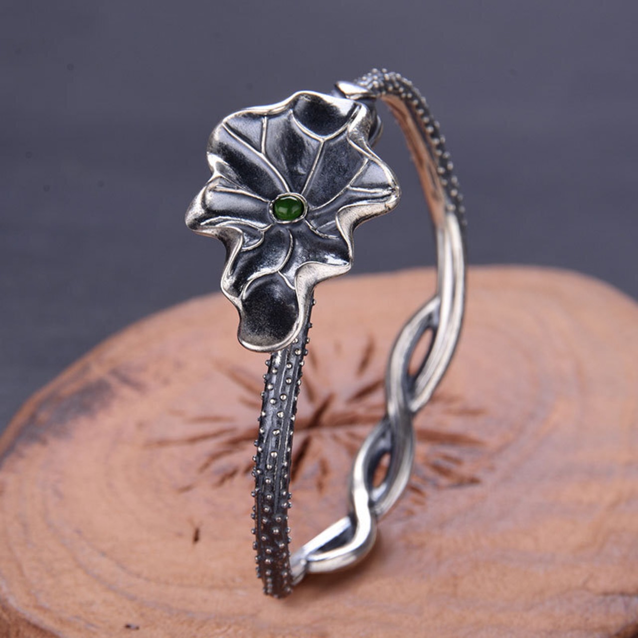 LIVVY 2022 タイシルバーカラージュエリー蓮の葉のブレスレットとグリーンジルコンカフバングル女性クリエイティブパーティージュエリー 銀 Liv53922171729