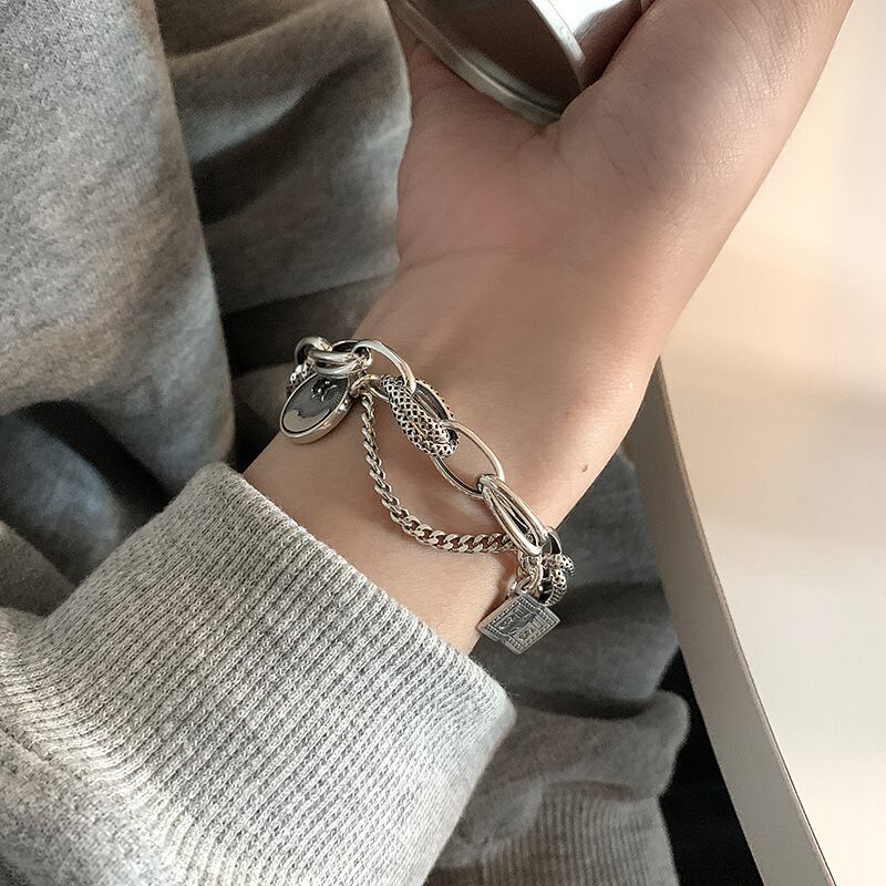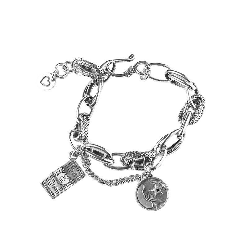 LIVVY タイのシルバー色の太いチェーンドルラウンドカードスターペンダントブレスレット女性手作りトレンディなパーティージュエリー 銀 Liv56794669776