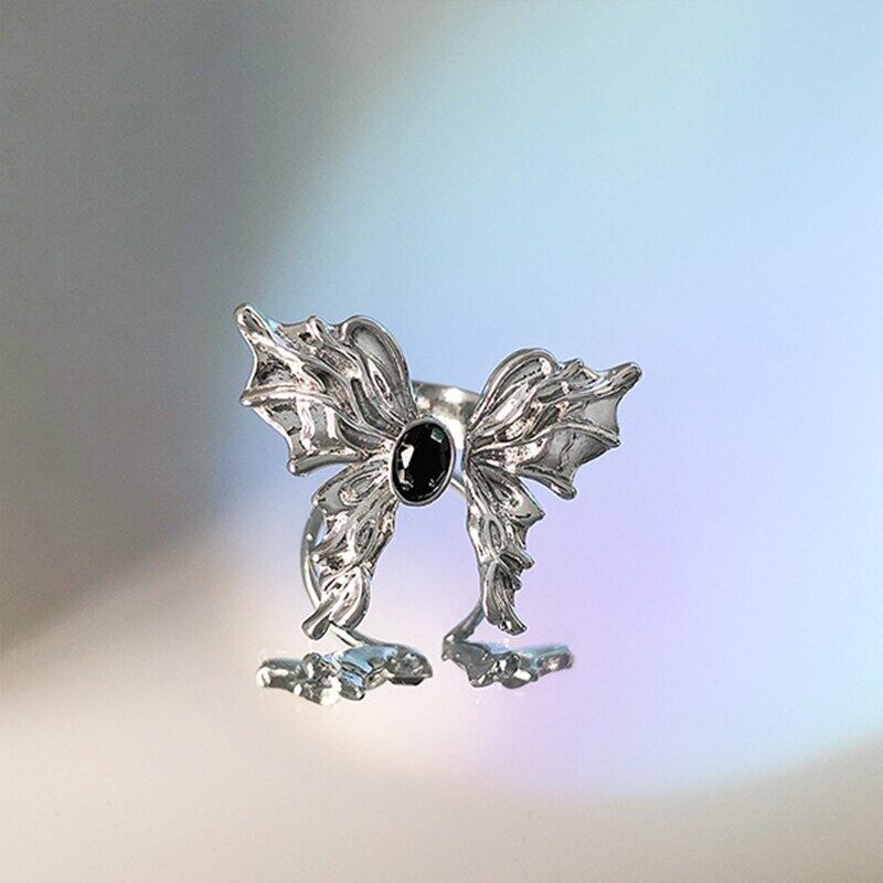 LIVVY シルバーカラーバタフライブラックオーバルジルコン調節可能なリング女性スウィートジュエリーアクセサリー婚約パーティーギフト 大人ガーリー キュート カジュアル アジャスタブル 指輪 銀 Liv26278692145