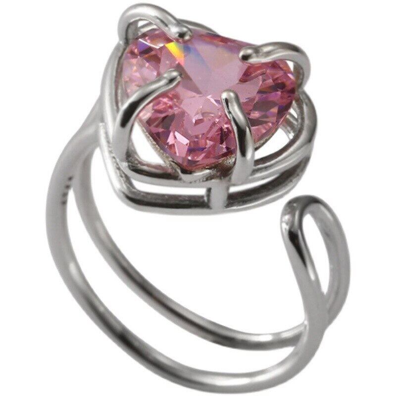 シルバーカラースウィートピンクジルコンラブハートリング女性カップルシンプルな二層中空幾何学パーティージュエリー レッド 大人ガーリー キュート カジュアル 指輪 銀 Liv54956418768