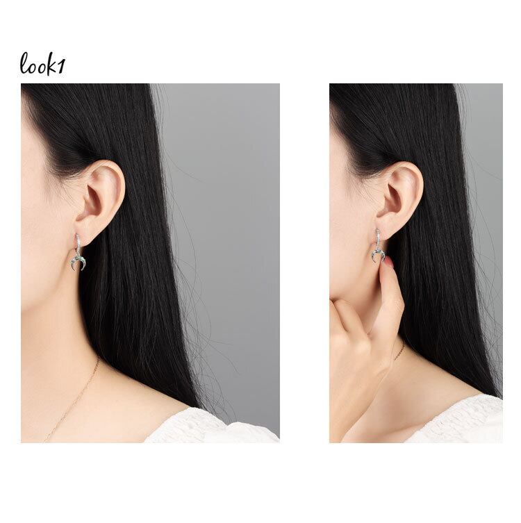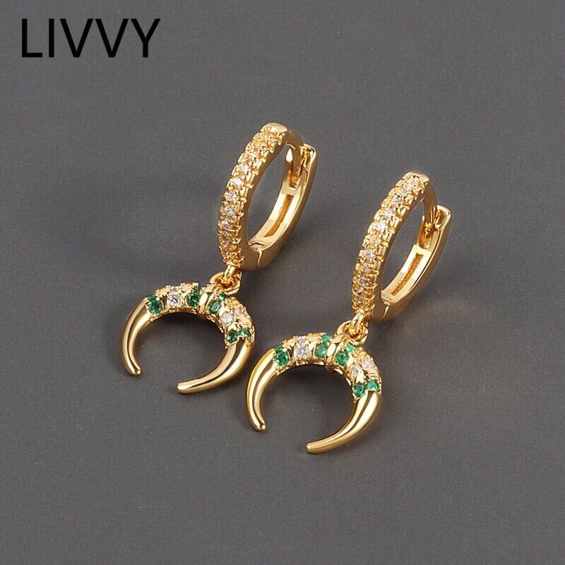 LIVVY シルバーカラーイヤリンググリーンジルコンムーンペンダントイヤリング女性トレンディライト高級ジュエリーパーティーアクセサリーギフト 銀 Liv33510010027