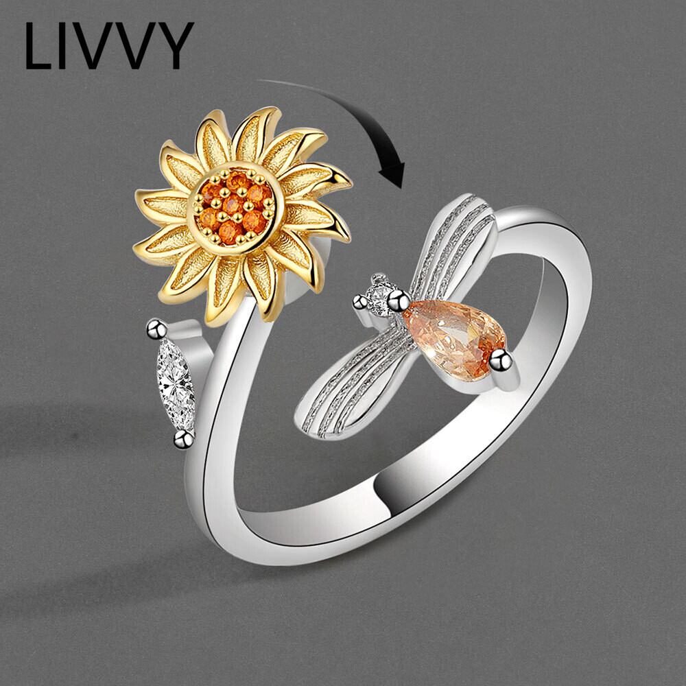 LIVVY トレンディ クリエーション 回転式 フラワー クリスタル ジルコン オープニング ハンドメイド リング レディース ファインジュエリー 指輪 フラワーデザイン Liv43698715132