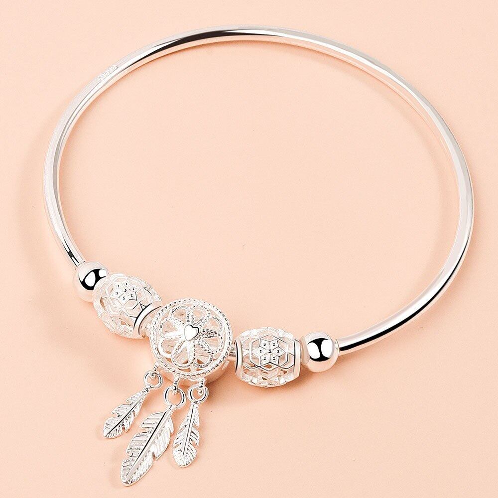 LIVVY シルバーカラーレトロ中空ボールフラワーフェザー Tel ブレスレット女性手作りバングルジュエリー フラワーデザイン 銀 Liv61897561375