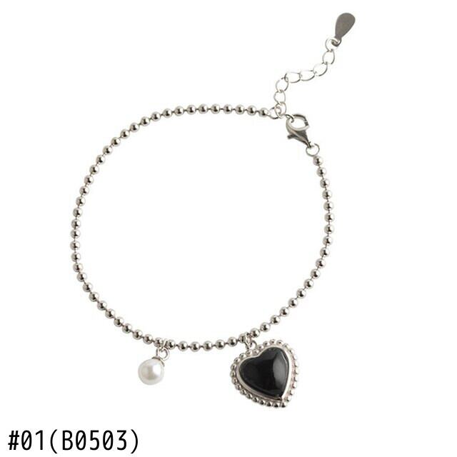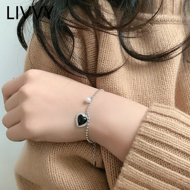 LIVVY シルバーカラーブラックラブハートパールペンダントビーズチェーンブレスレットインシンプルな花嫁ジュエリーギフト 真珠 銀 Liv6435952407