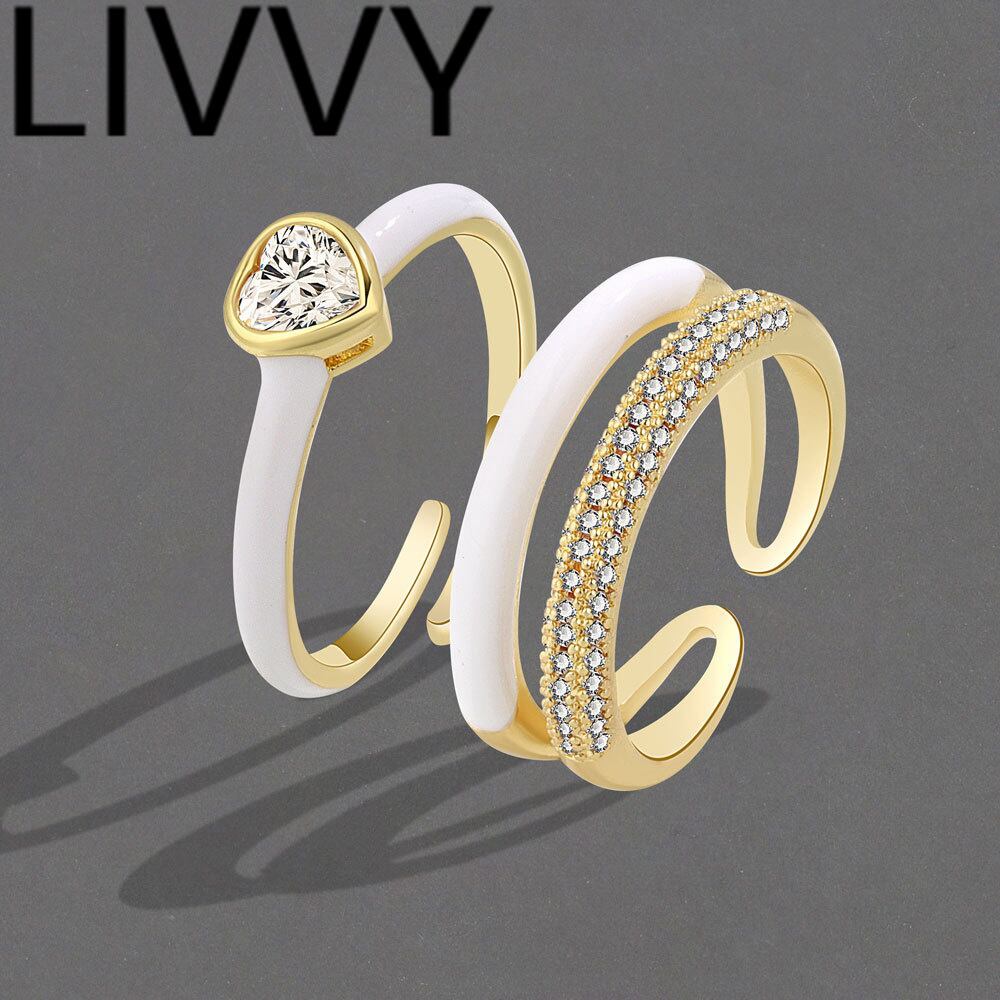 LIVVY ゴールドカラーダブルラブリング調節可能なオープニングジルコンリング女性ブライダルジュエリーアクセサリー アジャスタブル 指輪 Liv54335336410