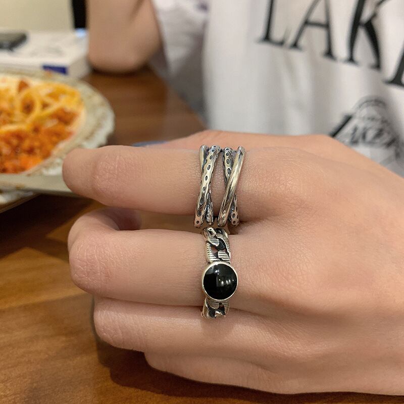 LIVVY シルバーカラーブラックラウンドチェーンリング女性ダブルクロスレトロオープニングジュエリーアクセサリーギフト 指輪 銀 Liv41626226125