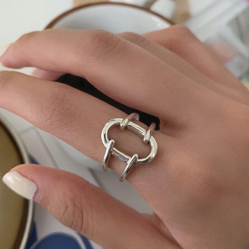 LIVVY シルバーカラーミニマリストオーバル中空幾何学トレンディリング女性の誕生日パーティーウォータージュエリーギフト 指輪 銀 Liv45309691323