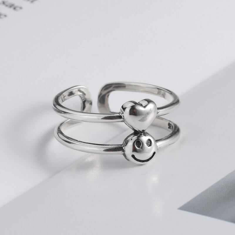 LIVVY シルバーカラーミニマリストダブルデッキ調節可能なリング女性笑顔ハート形の誕生日パーティージュエリー Gif アジャスタブル 指輪 銀 Liv16484516577