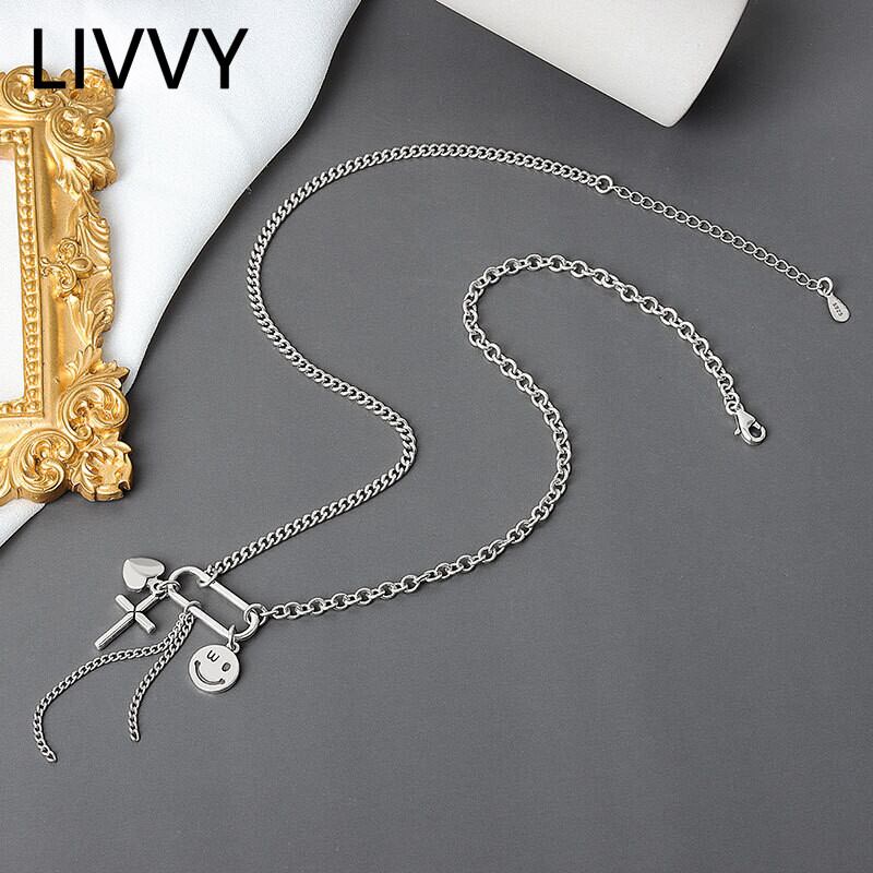 LIVVY シルバーカラー Tel ネックレス女性スマイリーフェイス愛するハートクロストレンディな誕生日パーティージュエリーギフト レース 銀 Liv57199177831