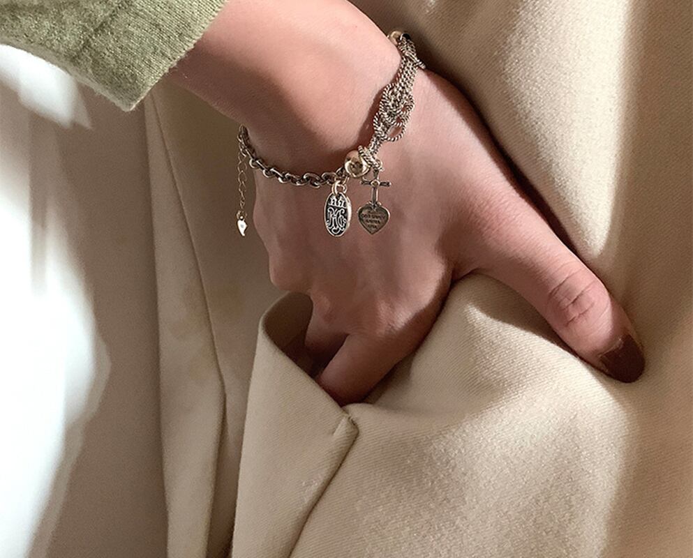 LIVVY クロス ラブ ハート トライアングル オーバル タイ シルバー カラー ブレスレット レトロ イン ユニーク Fshion ジュエリー ギフト 銀
