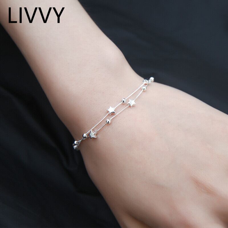 シルバーカラークリック五芒ラウンドビーズ二重層ブレスレットチャームトレンディパーティージュエリー調整可能 アジャスタブル 銀
