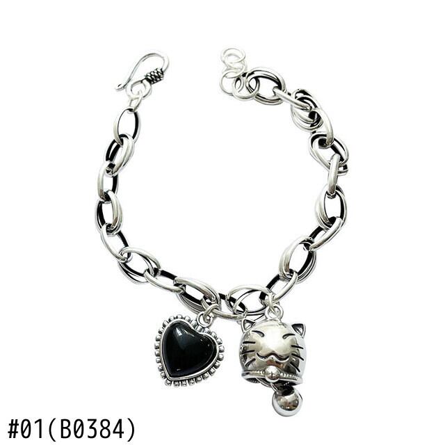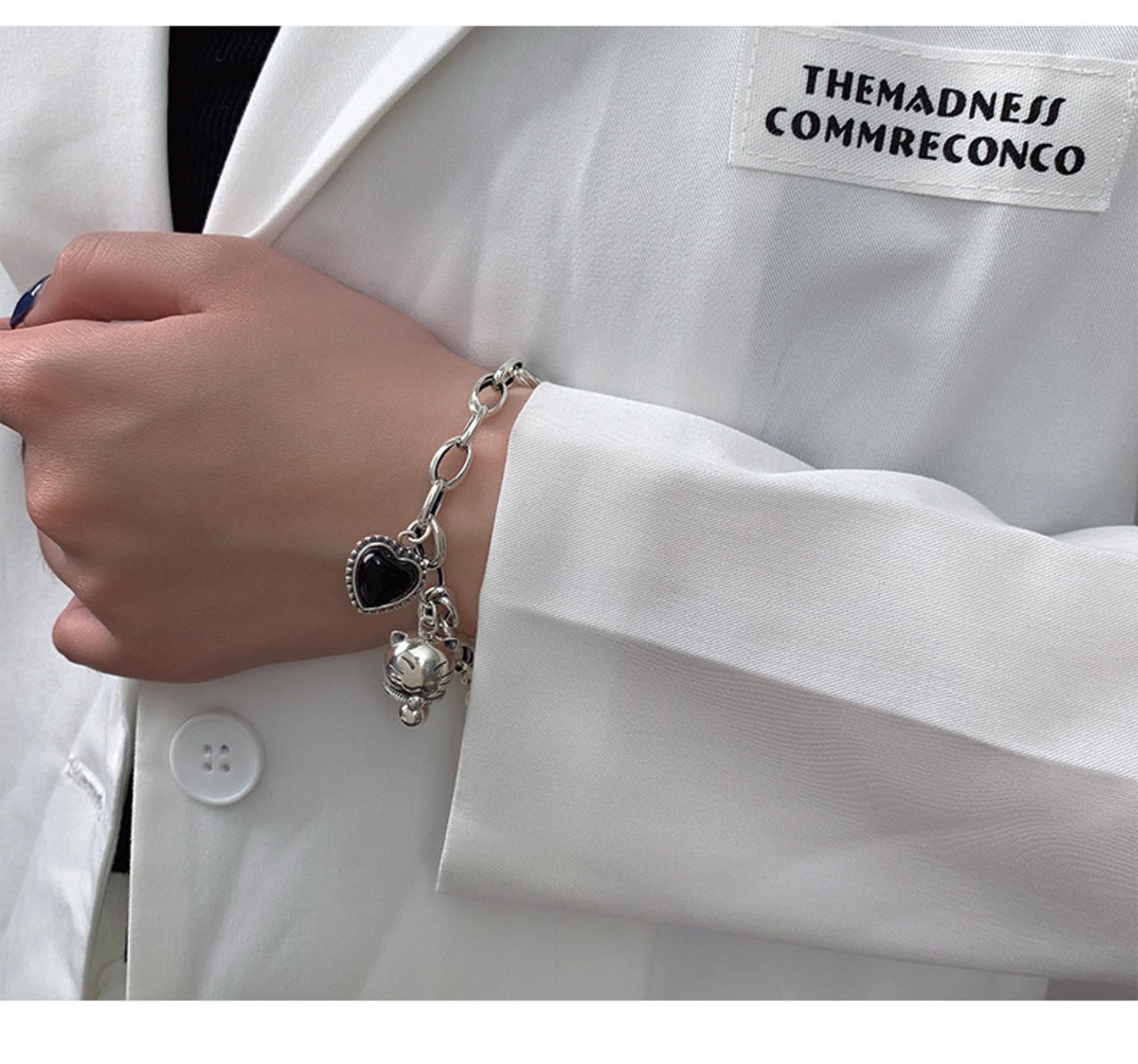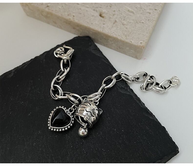 LIVVY シルバーカラー オーバル 太いチェーン ブラック LOVE ハート ラッキーキャット ペンダント ブレスレット シンプル ジュエリー ギフト 銀