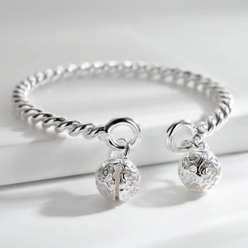 LIVVY シルバーカラーツイスト織ブレスレットダブルボール絶妙ユニークオープニングバングルジュエリーギフト 銀