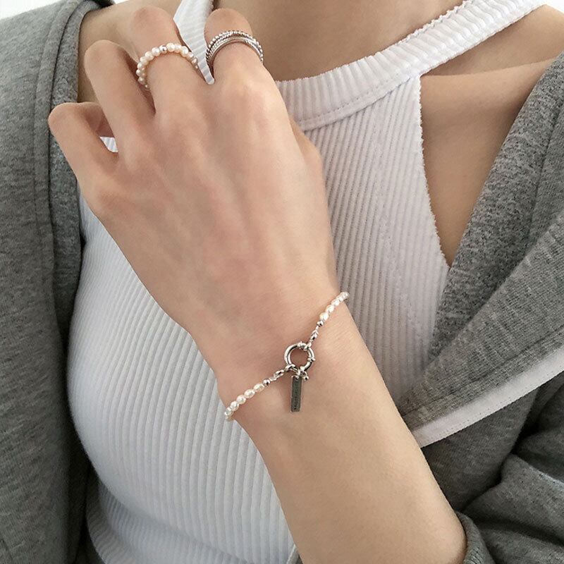 LIVVY 長方形英字パールスクエアチェーンブレスレット手作りファインジュエリー誕生日プレゼント 真珠 スクウェア