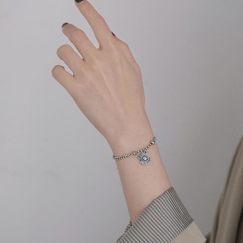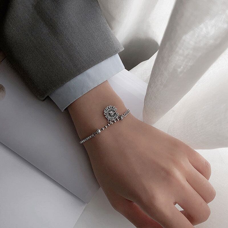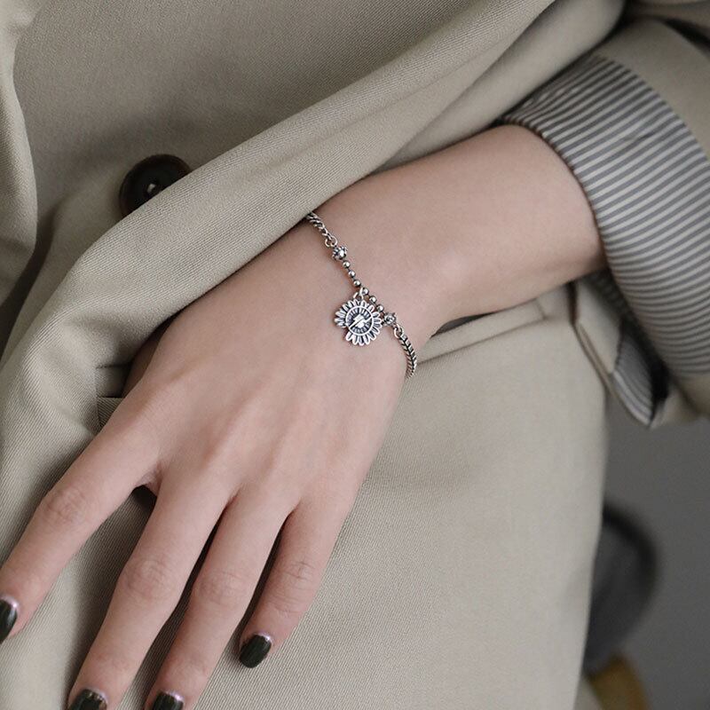 LIVVY トレンディブラックリトルデイジーサンフラワーブレスレット手作りタイシルバーカラーパーティージュエリー フラワーデザイン 銀