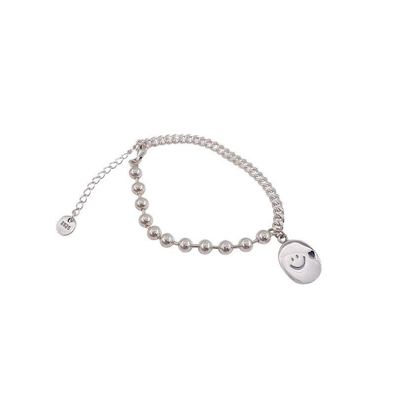 LIVVY シルバーカラービーズチェーンスマイルラブハートラウンドペンダントブレスレットガールズスウィートトレンディパーティージュエリーギフト 大人ガーリー キュート カジュアル 銀