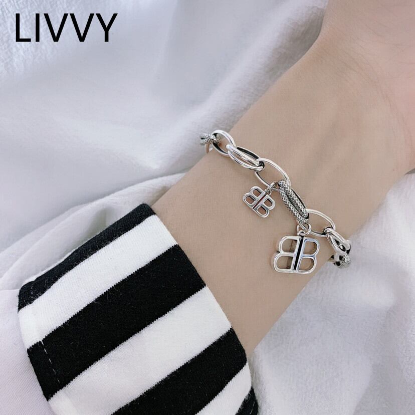 LIVVY シルバーカラー太いチェーンダブルレター B ペンダントブレスレットカップルパンクパーティージュエリー 銀