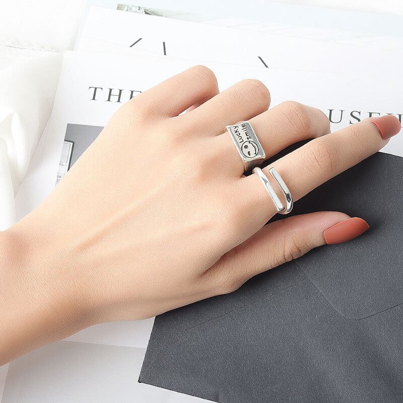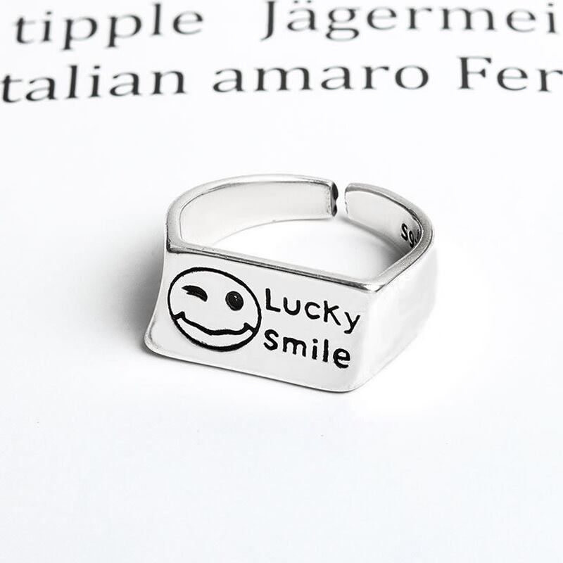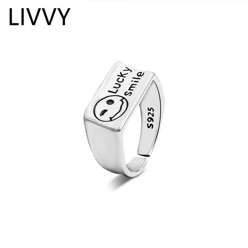 LIVVY シルバーカラー運笑顔リング調節可能リングファインジュエリートレンディパーティービジューギフト アジャスタブル 指輪 銀