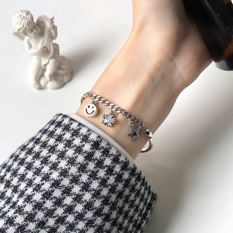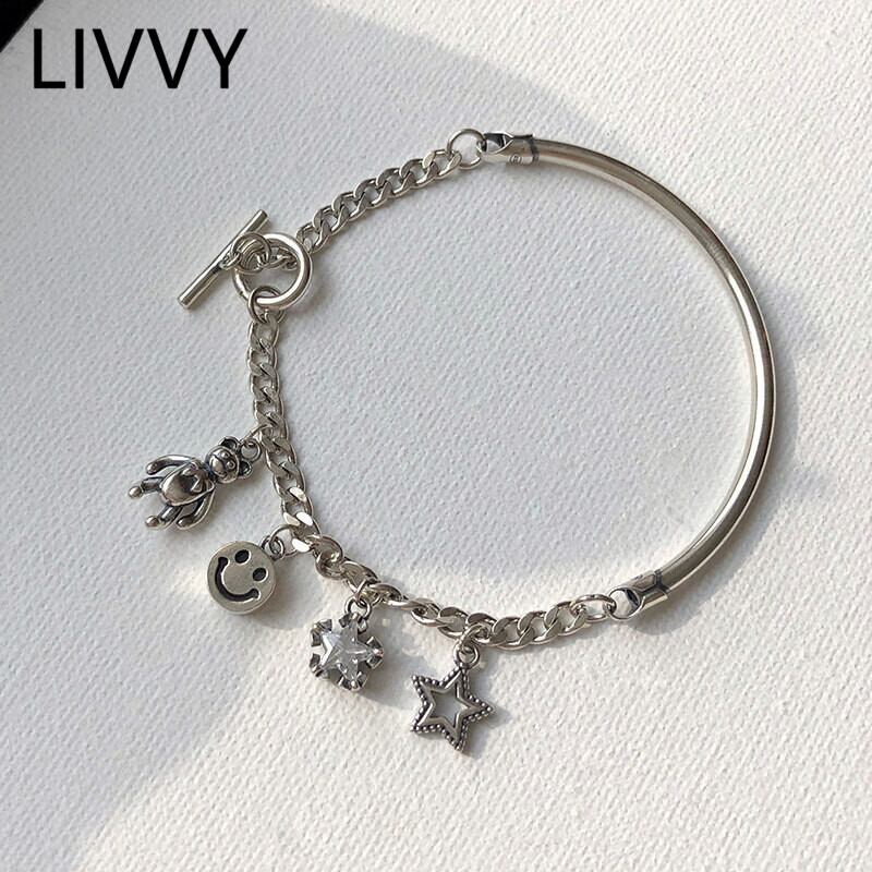 LIVVY レトロクマスター笑顔ペンダントブレスレットユニークヒップホップタイシルバーカラーバングルギフト 銀