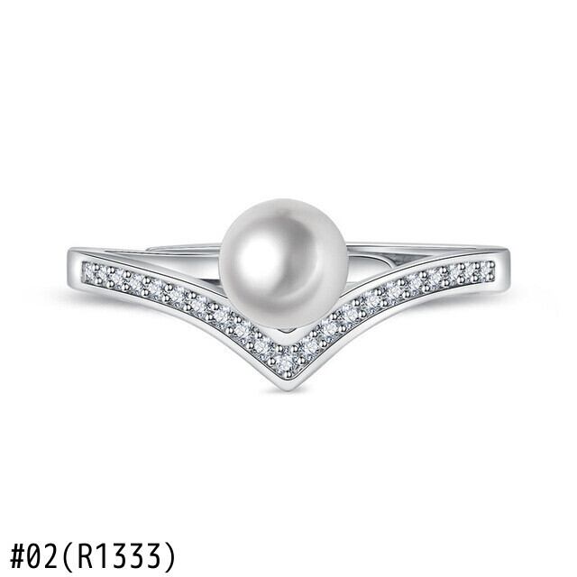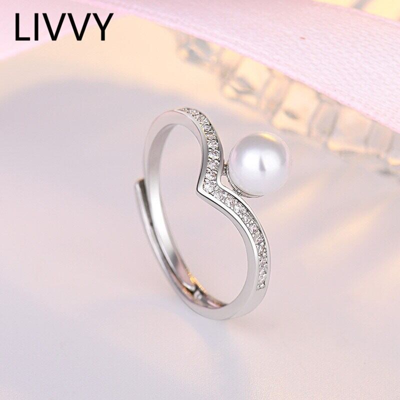 LIVVY シルバーカラーパールジルコンオープンリングシンプルライト高級パーティージュエリーギフト 指輪 真珠 銀