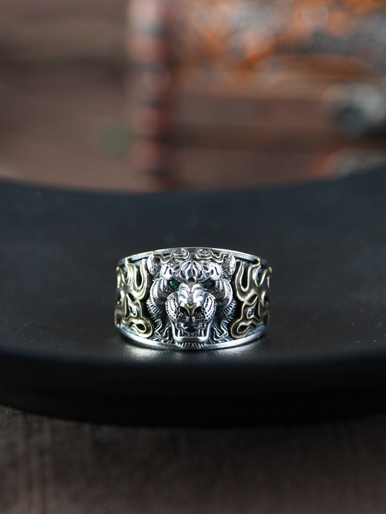 LIVVY シルバーカラートレンディオープニングウルフタイガーヘッドリングアニマルパンクヒップホップ横暴メンズリングパーティージュエリー 指輪 銀