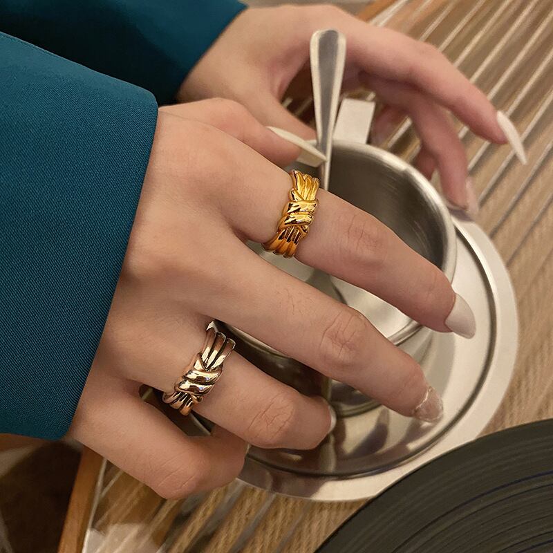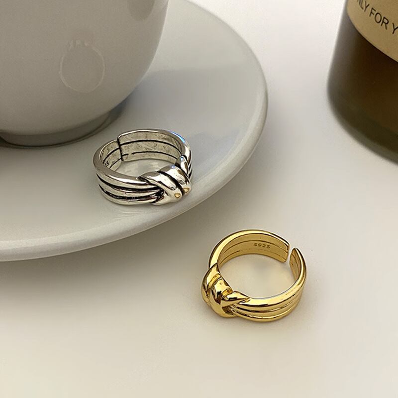 LIVVY シルバーカラー多層クロスノット形状オープニングリングトレンドクリエイティブ手作りシンプルジュエリー 指輪 銀