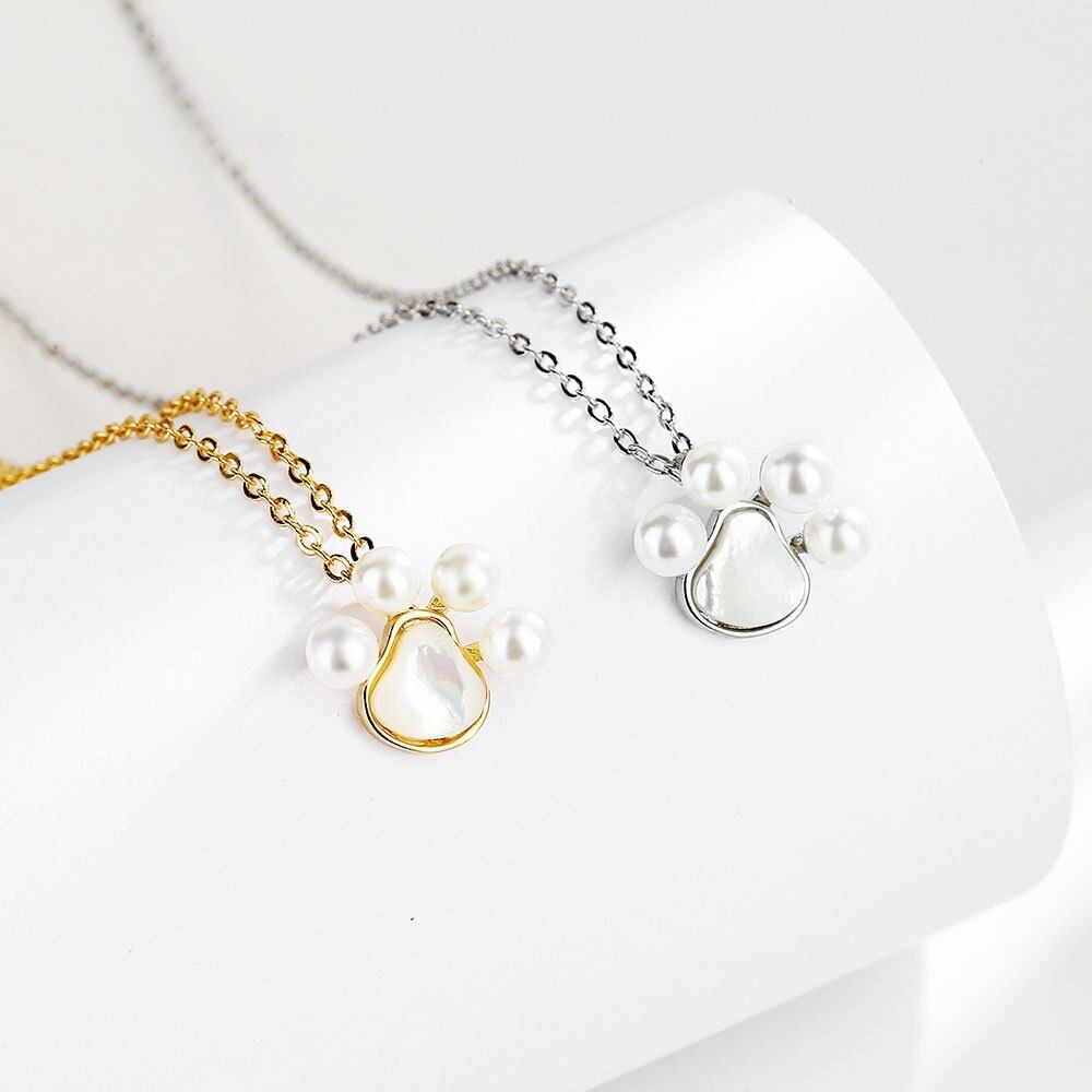 LIVVY シルバーカラー動物犬猫足跡パールペンダントネックレスジュエリー レース 真珠 銀