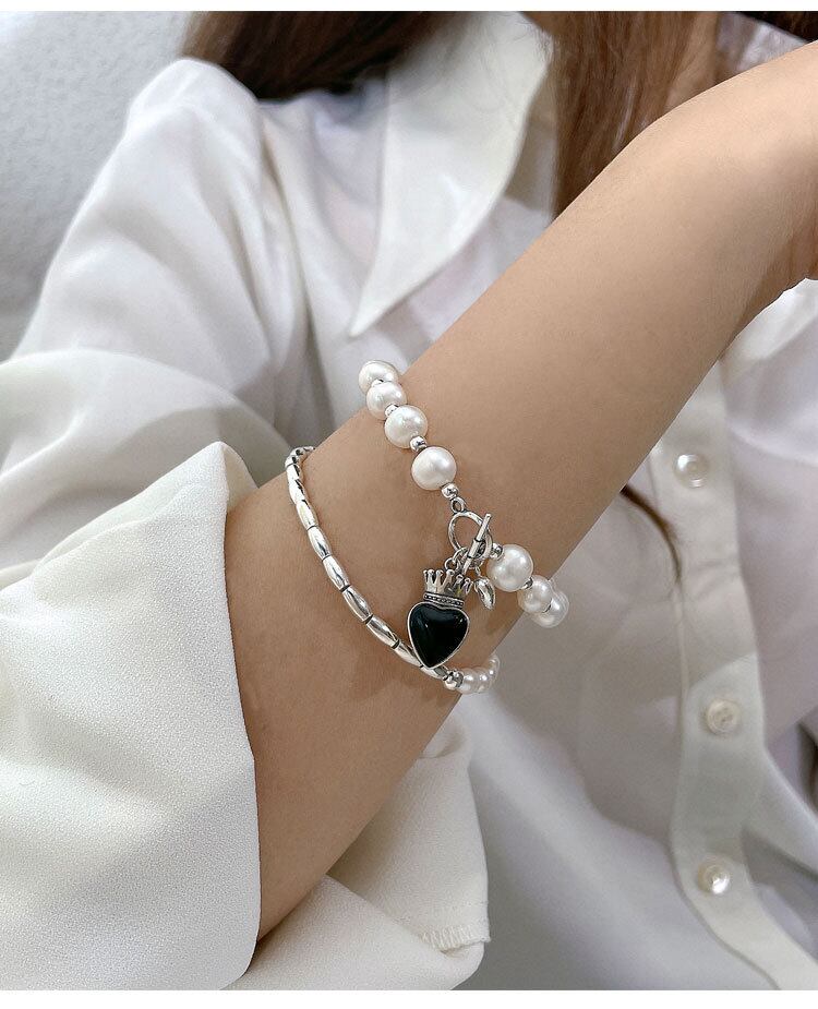 LIVVY ブラッククラウンラブハート OT バックルパールシルバーカラーブレスレットロマンチックスタイルジュエリーアクセサリーギフト 真珠 銀