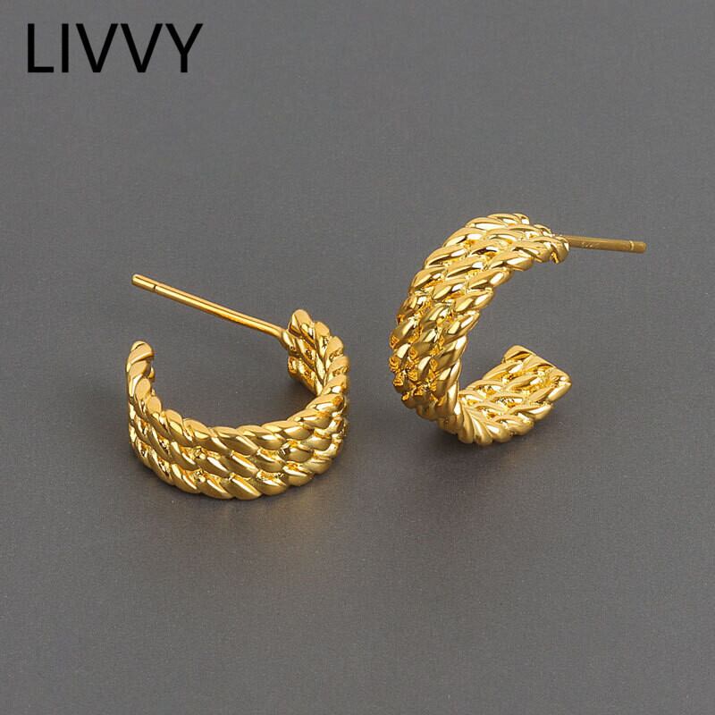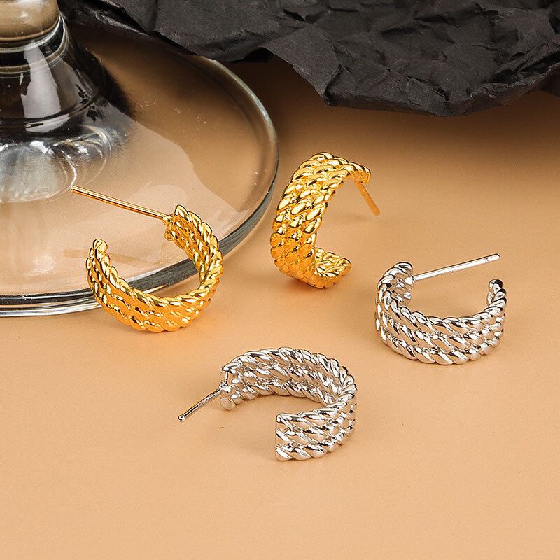 LIVVY アレルギー防止シルバーカラーツイストロープ多層ライントレンディイヤリングカップル手作りジュエリー 指輪 銀