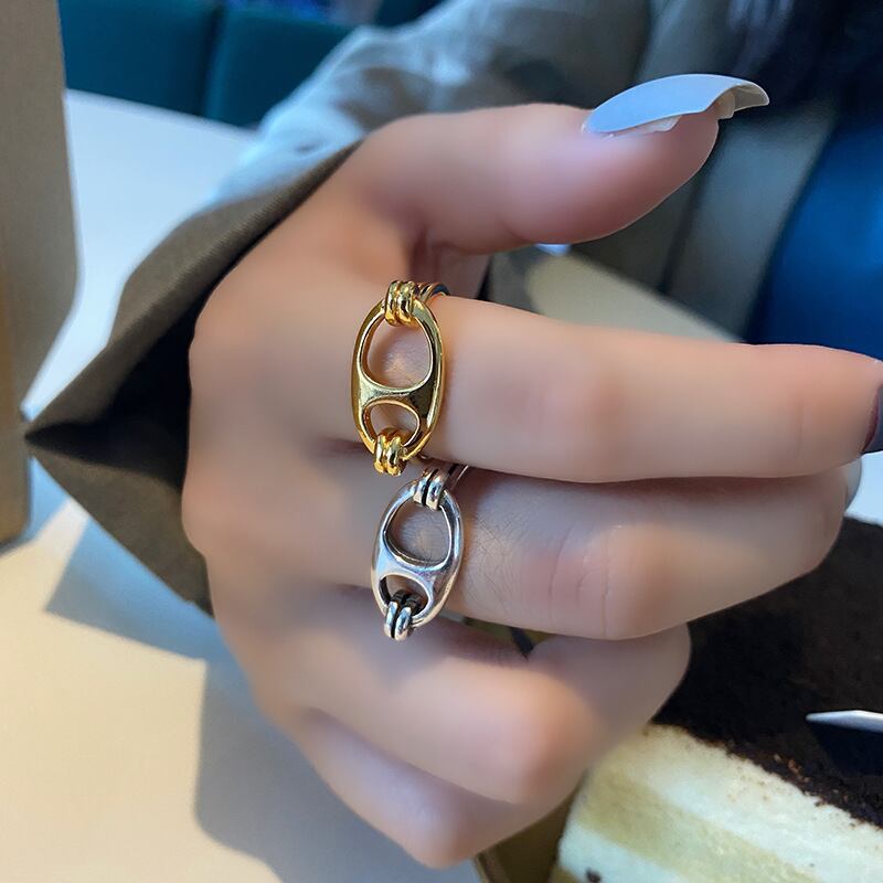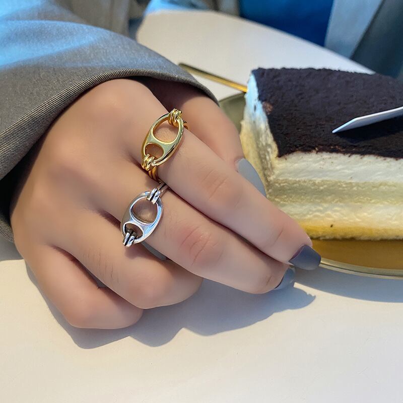 LIVVY シルバーカラー幾何学的オーバル中空リング気質ファインジュエリーアクセサリー 指輪 銀