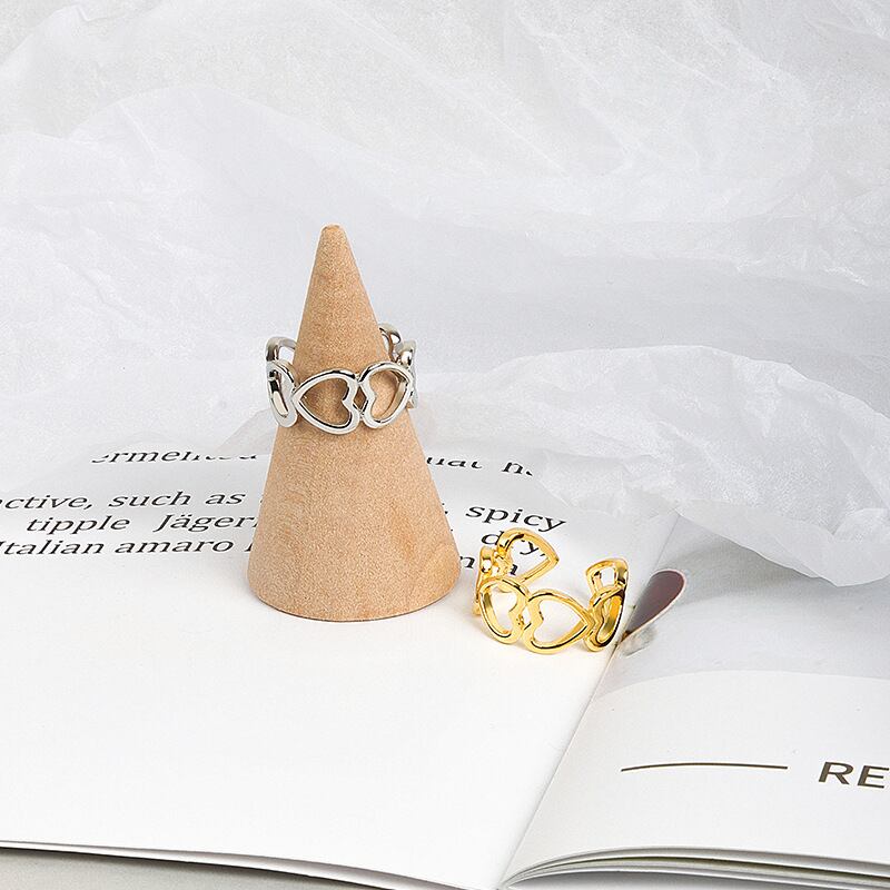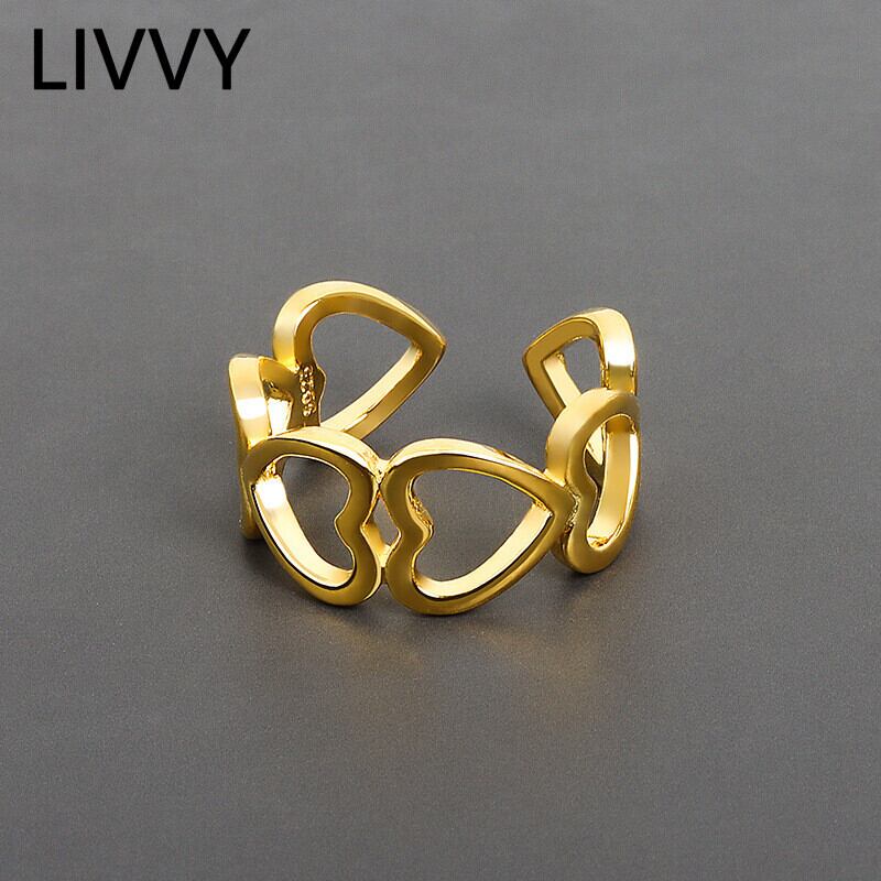 LIVVY シルバーカラー中空ラブハートチェーンオープニングリングファインジュエリートレンド 指輪 銀