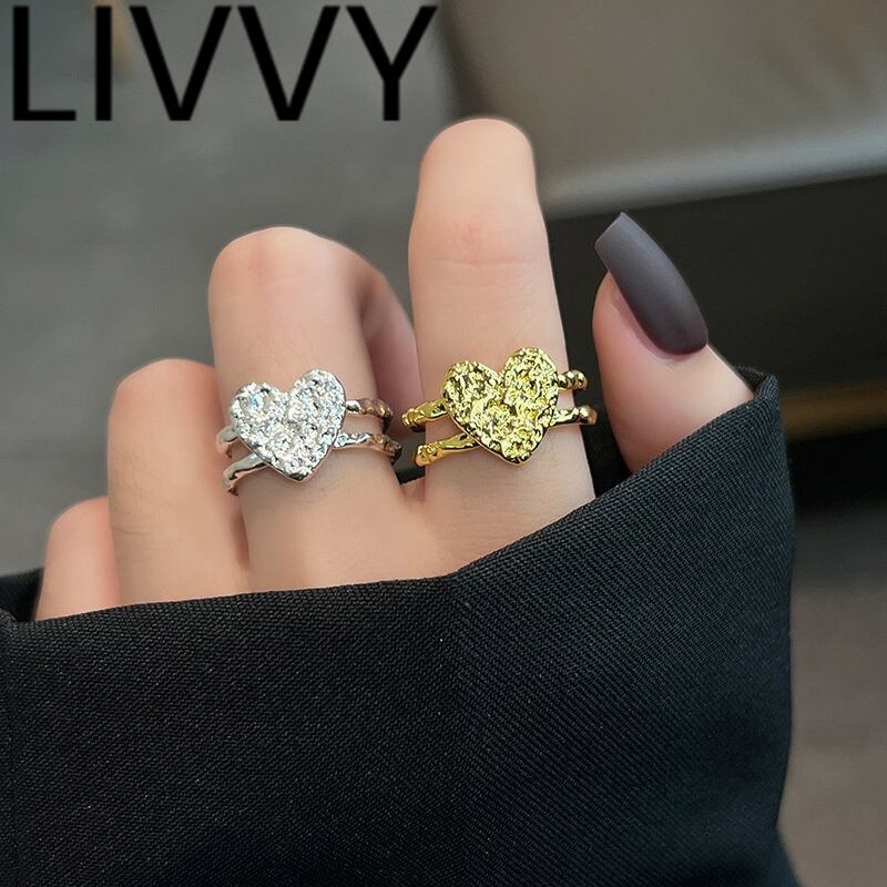 LIVVY シルバーカラーラブハートリング不規則パターン幾何学的ダブルデッキリングパーティージュエリーギフト 指輪 銀