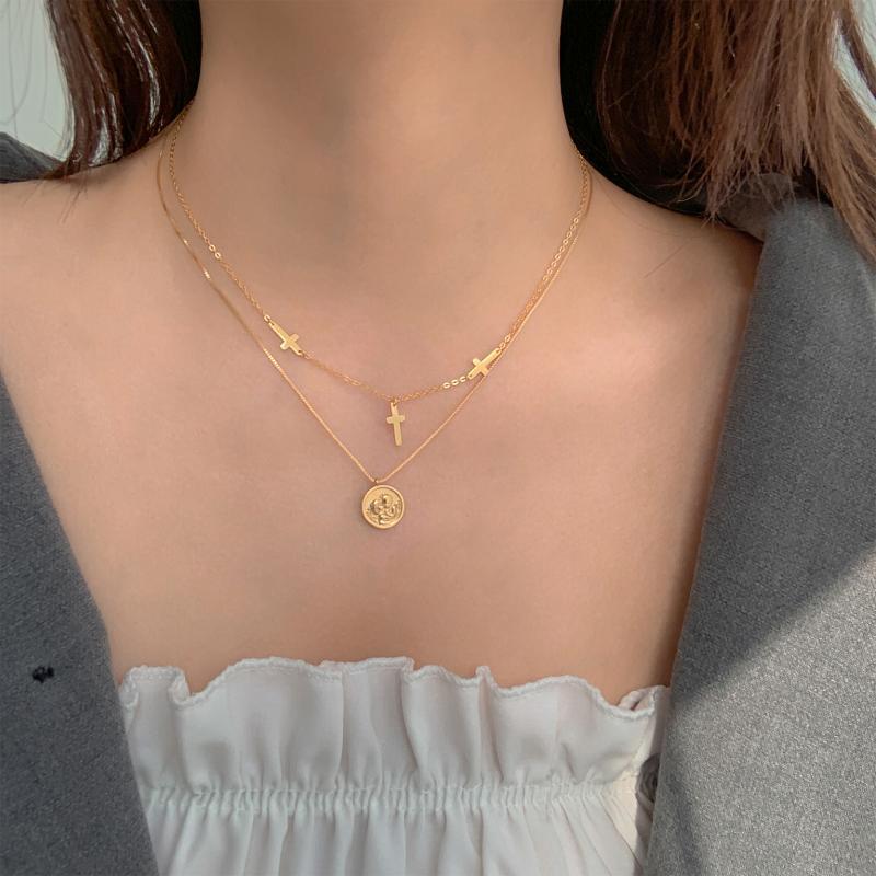 LIVVY シルバーカラー二層ネックレスラウンドエンジェルクロス鎖骨チェーンファインジュエリー レース 銀