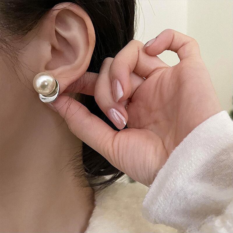 LIVVY シルバーカラーパールイヤリングシンプル幾何学的ラウンド耳スタッド花嫁ジュエリーアクセサリー 真珠 指輪 銀