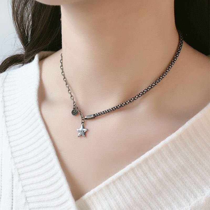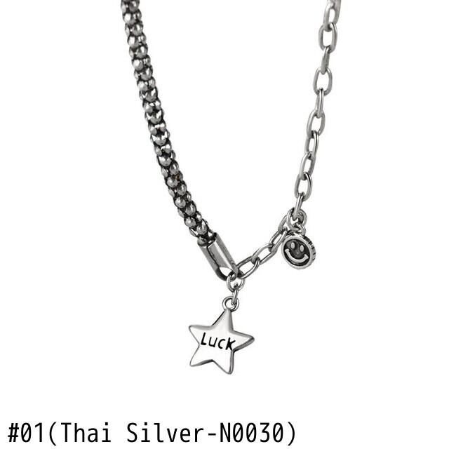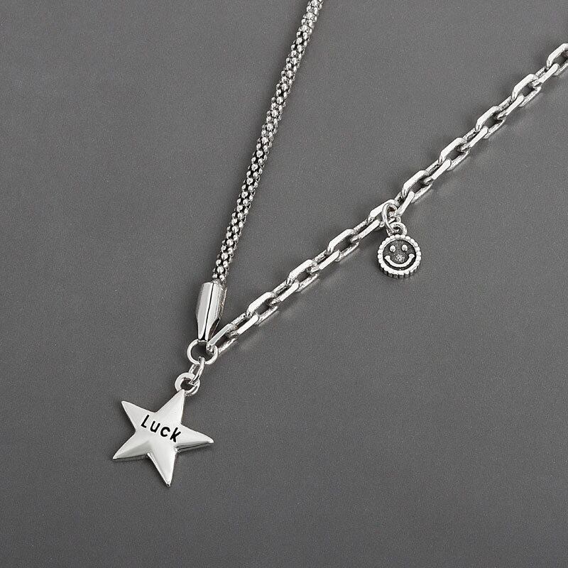 LIVVY シルバーカラースマイルフェイススター幾何ペンダントネックレスタイシルバーファインジュエリー レース 銀