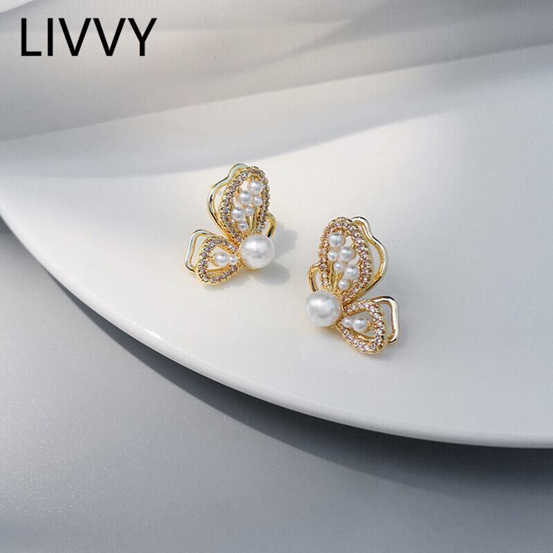 LIVVY バタフライパールスタッドピアスライト高級トレンディエレガンス気質パーティーアクセサリー イヤリング 真珠 リング 指輪